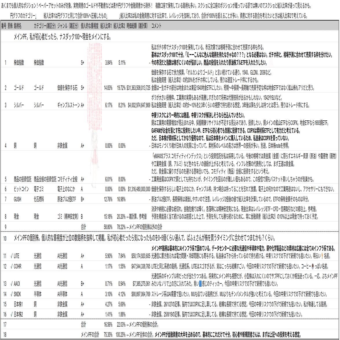 ・メインPF銘柄は最高値を更新したり、原油株は当然に利益が伸びているが、地金ガチホ枠とギャンブルPFは減っているので、トータルで考えると資産額は私も減っています。