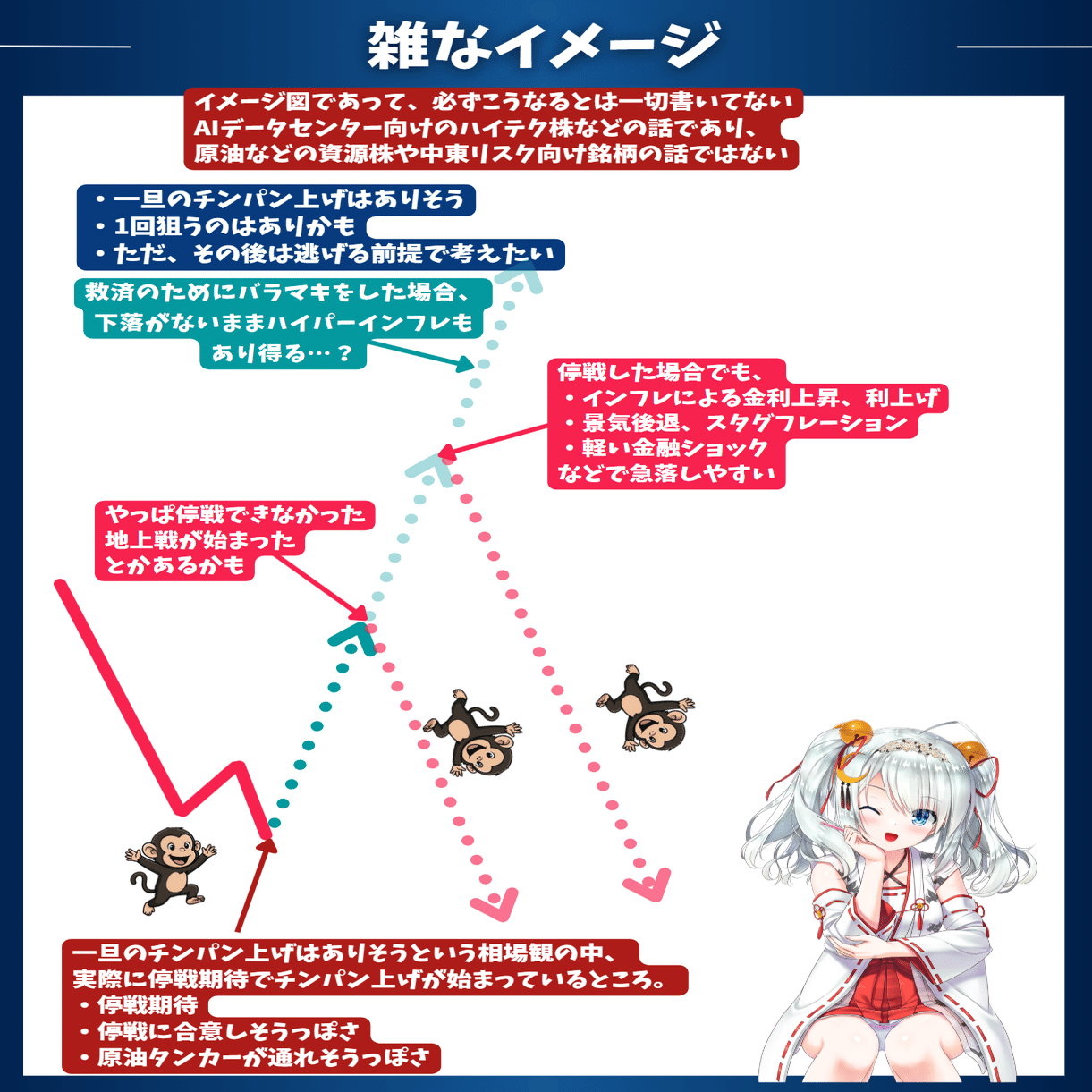 ・停戦期待で一旦のチンパン上げがそろそろ来そう!という図を今週作って実際に停戦期待のチンパン上げが来ているので、十分当たってるとは思います。私にできることは十分できていると思うので、それを見てどうするかは個人の性格ですね。生き残ることを最優先にして全て現金化していたとしても、恥じるようなことではありません。