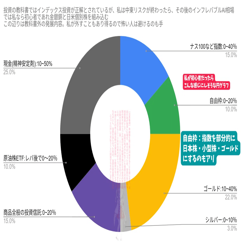 ・今週はゴールドを買うと思うので、円グラフの現金を30→25、ゴールドを17→22%にしてみた。
